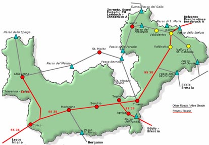 La strada statale SS38 collega Colico a Bolzano transitando da Morbegno, Sondrio, Tirano, Bormio e dal Passo Stelvio (chiuso d’inverno).